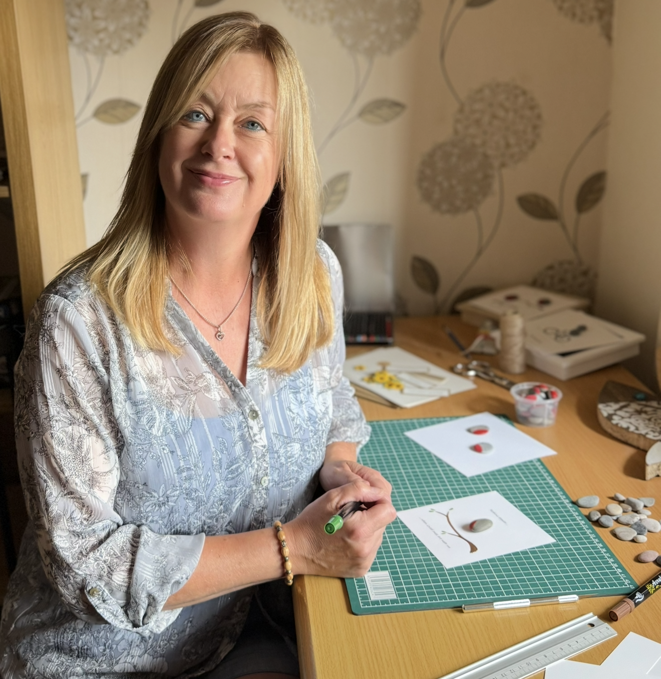 As a young girl I was always interested in art but there was little encouragement to take it further at school to forge a career, so as an adult, I ended up being a picture framer for 15 years, framing other people’s artwork. Fast forward to 2019, I started making handmade cards in my spare time to help me relax. People liked them, so I started selling them to friends and family and from there I opened up my Etsy shop, Penny Patch Designs. The last 6 years have been a whirlwind with nearly 4000 Etsy sales under my belt and I have loved every minute. I have broadened my product range and love making pebble pictures, which are hugely popular, and all of my products can be personalised, so they make fabulous individual gifts. I also make objet d’art made from scraps of wood, such as decorative key hooks and rustic wooden hanging fish, with the help of my husband, Mike 🥰. The main aim in my work is to use recycled materials wherever possible; where you see a lollipop stick…. I see a picket fence, you see a scrap of paper…. I see a painted card, you see an old floorboard…. I see a rustic fish. The amount of times I have rummaged through our kindling basket to salvage scraps of wood! This year has been busier than ever but I feel my biggest achievement of 2025 is being invited in to the beautiful Teme Valley Artisans shop in Tenbury Wells. This enables me to sell my products locally and be part of an amazing team of artisans all working together selling our handmade pieces in a ‘High Street’ setting and I am very excited for this new chapter ♥️. Sally Bowen-Woodward, Penny Patch Designs.